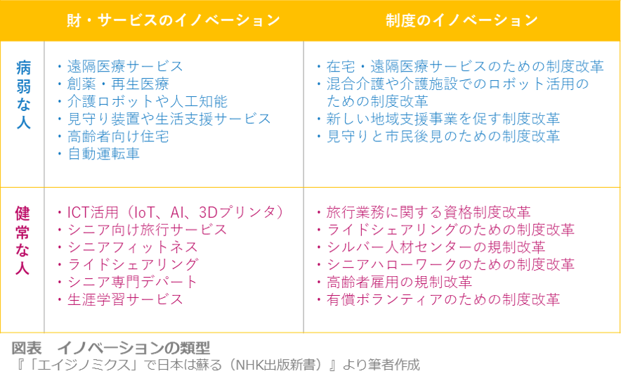 高齢化が生み出すイノベーションには、病弱な人に恩恵をもたらすものと健常な人に恩恵をもたらすものがあります。また別のパターン分けもできます。それは新しい財・サービスが主導するイノベーションと制度や仕組みの改革が主導するイノベーションです。例えば病弱な人には創薬、介護ロボット、遠隔医療など、健常な人にはシニア向け旅行サービスやシニアフィットネスなど様々な財・サービスが提供されるようになるでしょう。一方これら新しい財・サービスの導入や、高齢者の就労促進などの妨げになっている既存の制度や仕組みも数多く存在します。介護ロボットの導入や混合介護、旅行業務やライドシェアリングなどに関する制度改革、あるいは高齢者の生産人口への参入を容易にするような高齢者雇用の規制改革が、経済を活性化する可能性は大きいのです。